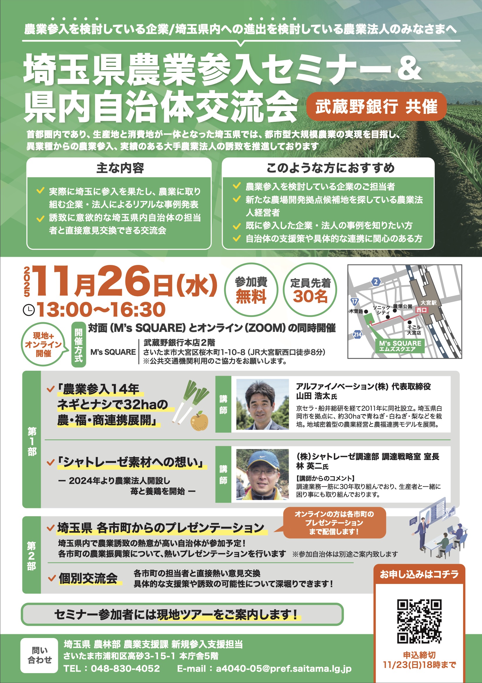 埼玉県はオンライン展示会(AGRIEXPOONLINE)や農林水産省主催の「農業参入フェア2025」に出展し、企業の皆様との接点を創出しています。