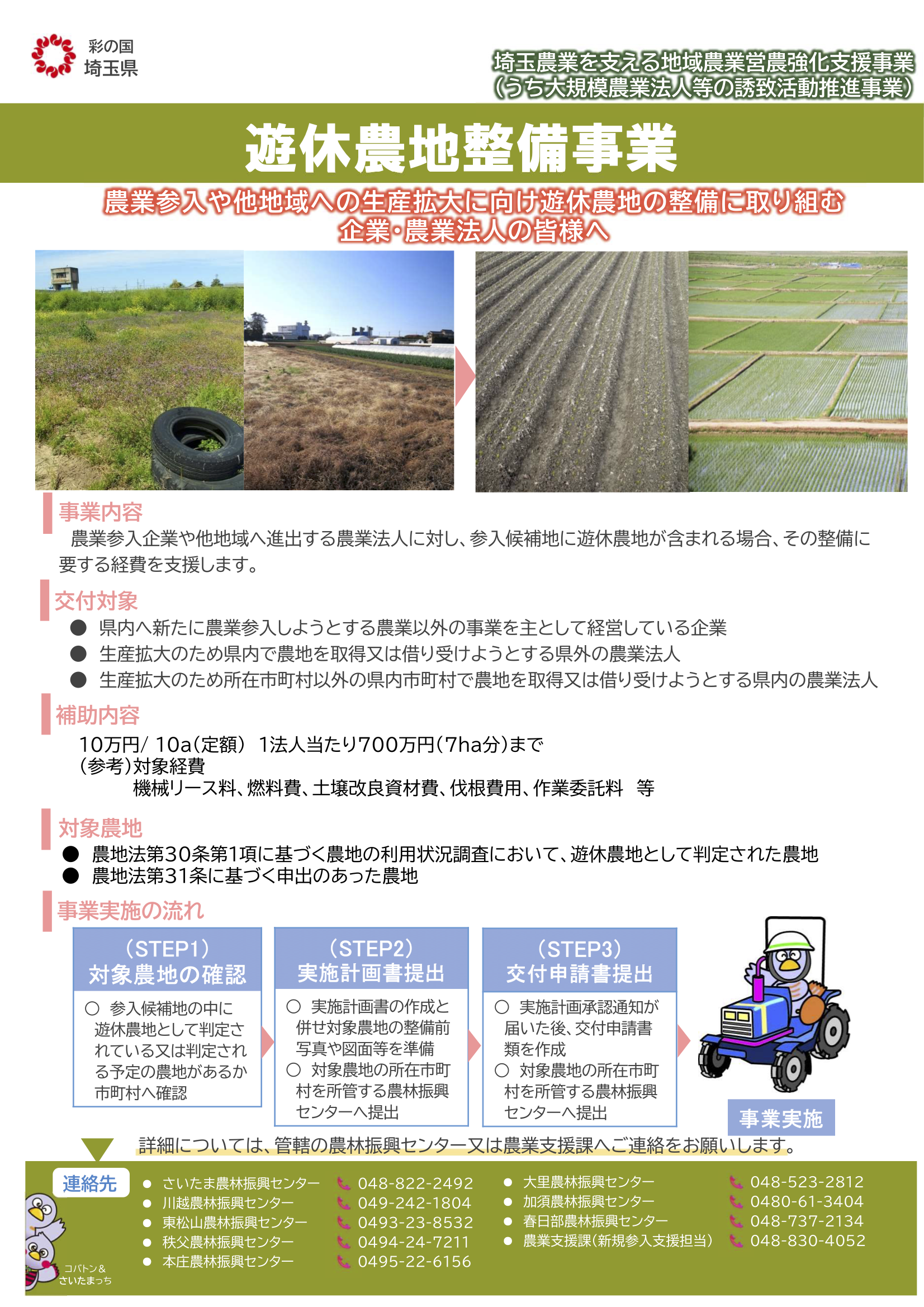 埼玉県では、異業種からの農業参入を志向する企業や県外農業法人の誘致を積極的に推進しており、参入先としての県の情報や魅力を紹介するイベントの開催や支援制度を設けております。